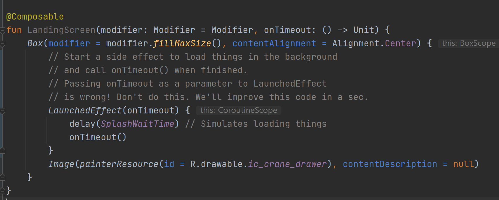 A side-effect in Compose is a change to the state of the app that happens outside the scope of a composable function. Changing the state to show/hide the landing screen will happen in the onTimeout callback and since before calling onTimeout we need to load things using coroutines, the state change needs to happen in the context of a coroutine!