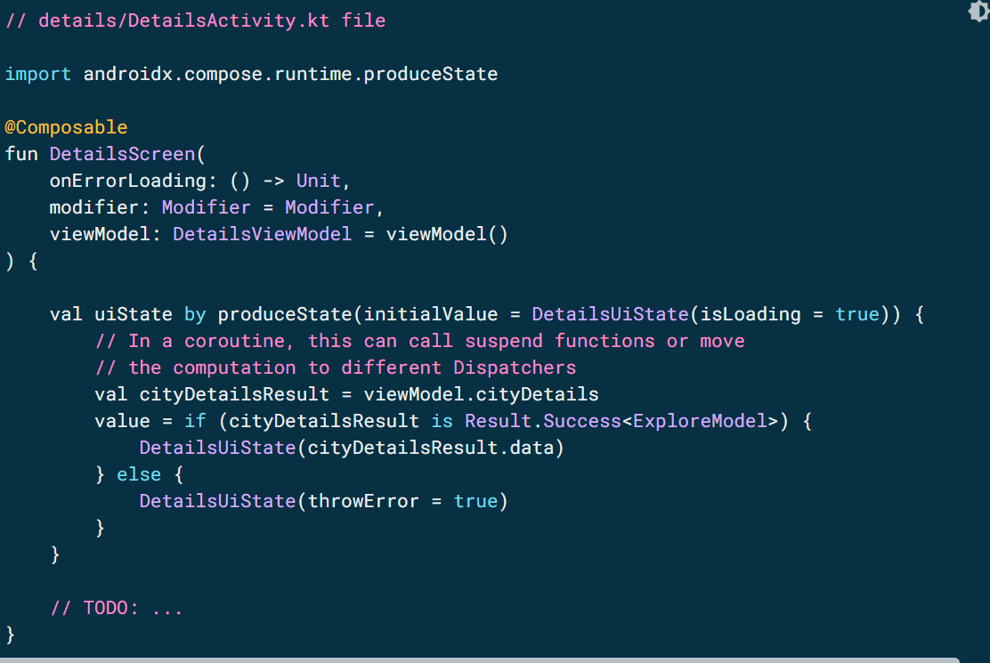 이 사용 사례에서는 다음과 같이 produceState를 사용하여 초기 값이 DetailsUiState(isLoading = true)인 uiState 업데이트를 내보낼 수 있습니다.