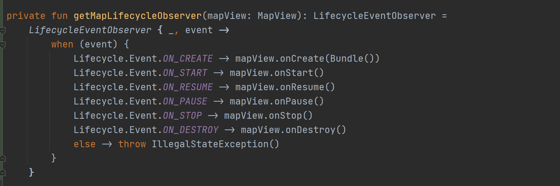 먼저 특정 이벤트에 따라 MapView에서 해당 메서드를 호출하는 LifecycleEventObserver를 반환하는 함수를 만들어 보겠습니다.