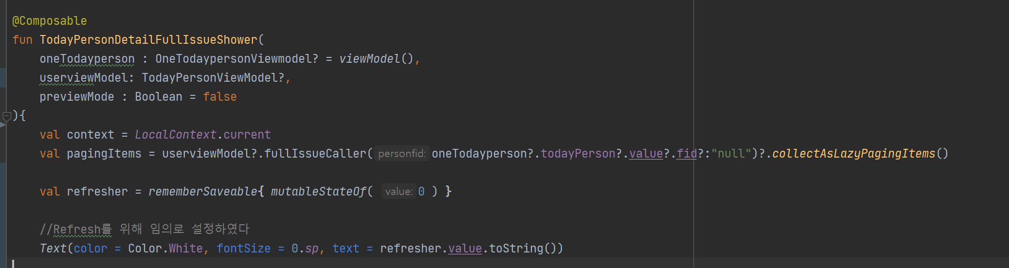 3. item의 id가 null 로 인지 된 경우 refresher mutableState를 임의 변형하여 recomposing을 강제해준다. recomposing강제는 Text 0.dp 와 같이 보이지않는 컴포즈를 하나 만들어주면된다.