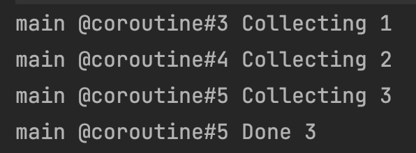 luanchIn은 CoroutineScope를 특정해주는 파라미터가 필요하다. 위 예제에서는 runBlocking coroutine builder가 this로 들어가서 동작하며, flow 가 running할때 runBlocking Scope은 wait for completion of its child coroutine 이므로, main fuction이 rerturning하여 terminating되지 않도록 막아준다.
