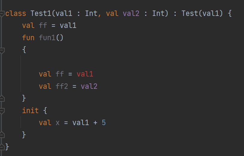 val/var를 생성자에서 생략하면 매개변수에 액세스할 수 있는 유일한 위치는 생성 시 평가되는 init block 이거나 class instance시 initializing되는 위치(val ff = val1)이다.