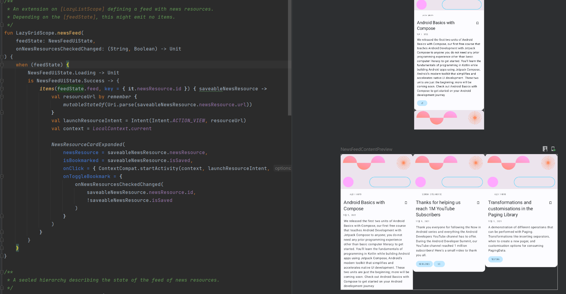 위 UiState는 NewFeeds.kt에서 아래와 같이 UI에 따른 state변화로 view을 control할때 사용됨. 추후 이 부분을 중점적으로 리뷰 해야겠음