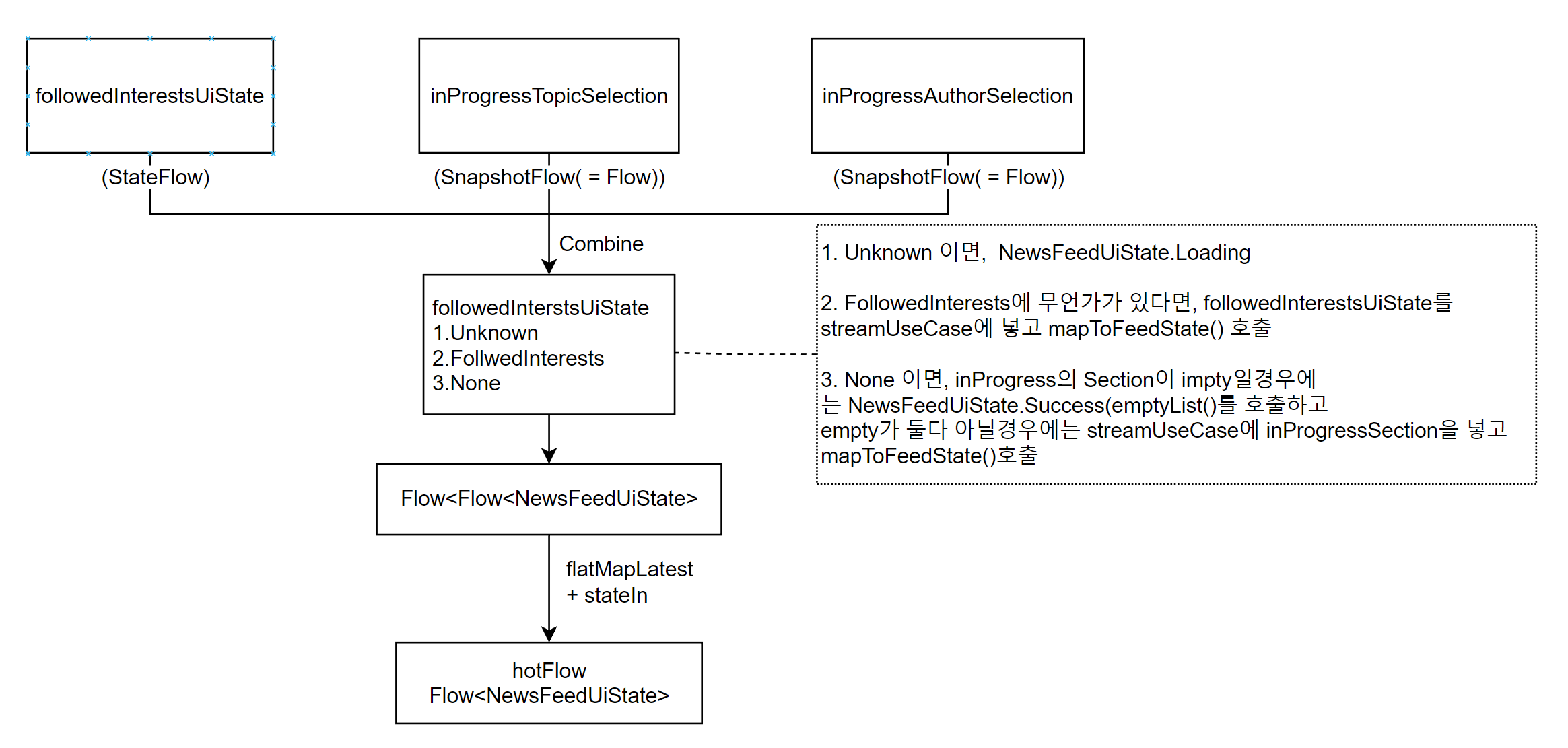 2) 이를 stateIn으로 viewmodelScope에서 동작하고 stopTimeout 5초, initialValue는 Unkown : FollowedInterestsUiState 상태를 가지는 hotFlow로 type change한다.