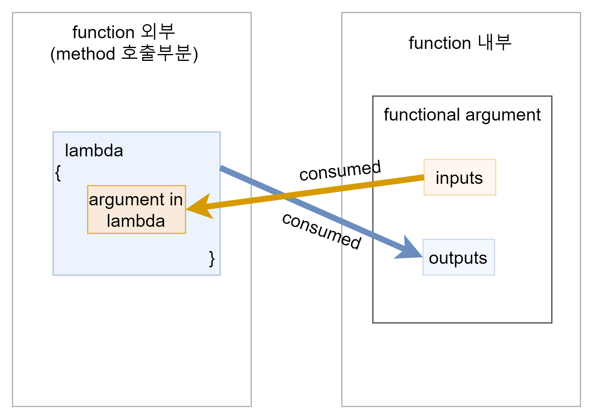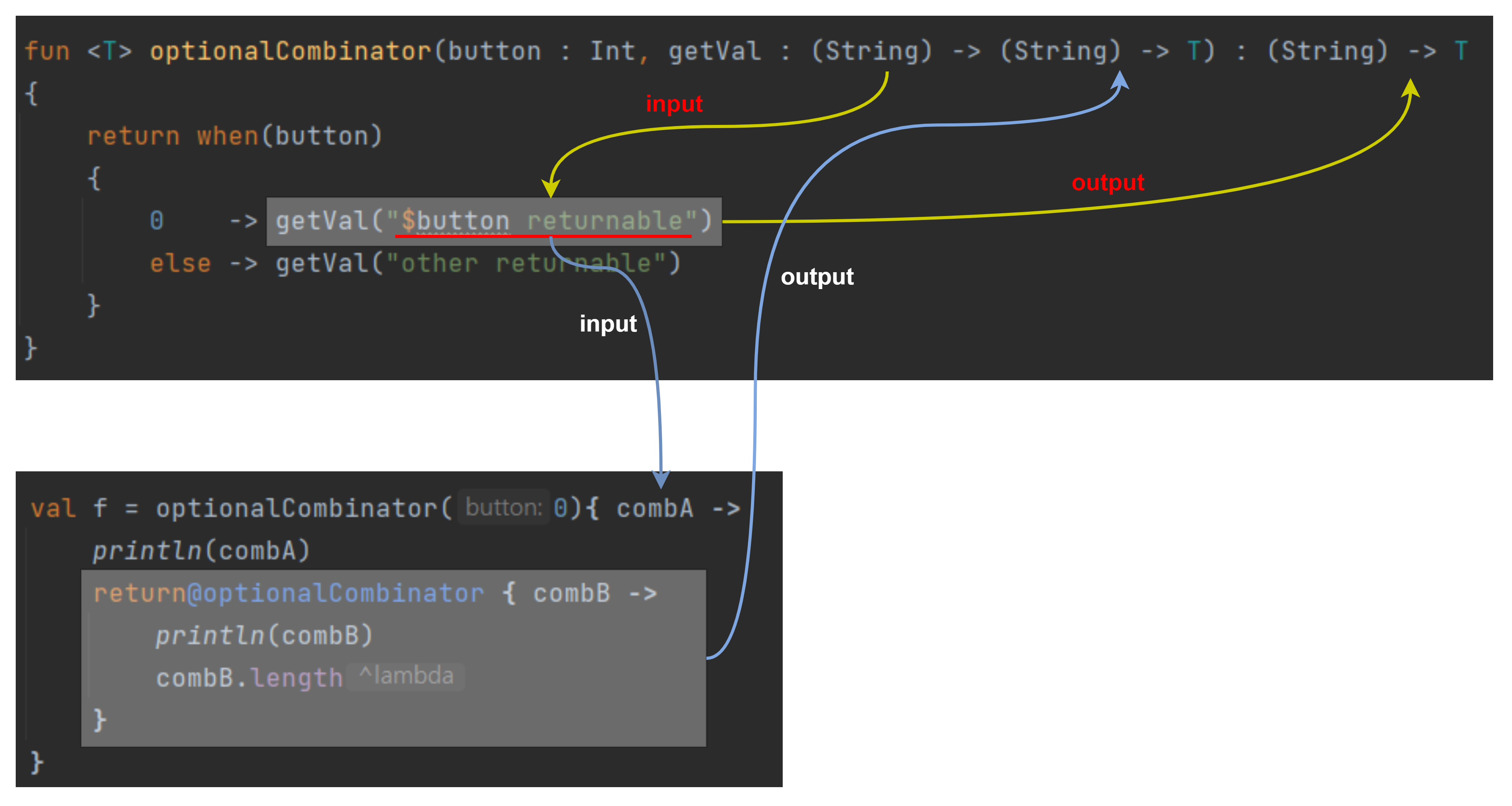 4> 다시한번, 아래의 이미지를 참조해서 이해를 해보면, getVal argument의 input 부분은 optionalCombinator 내에서 입력하고, 이에 대한 output 부분은 optionalCombinator 를 호출할때 lambda안에 싣어 보내야한다. 결과적으로 getVal의 output은 메소드의 내부에서 소모되고, 이에 대한 구현은 외부에서 (여기서는 val f 선언시) 이루어 짐. 반대로 getVal의 input은 메소드의 내부에서 생산되고, 외부 람다에서 소비 된다고 볼 수 있음