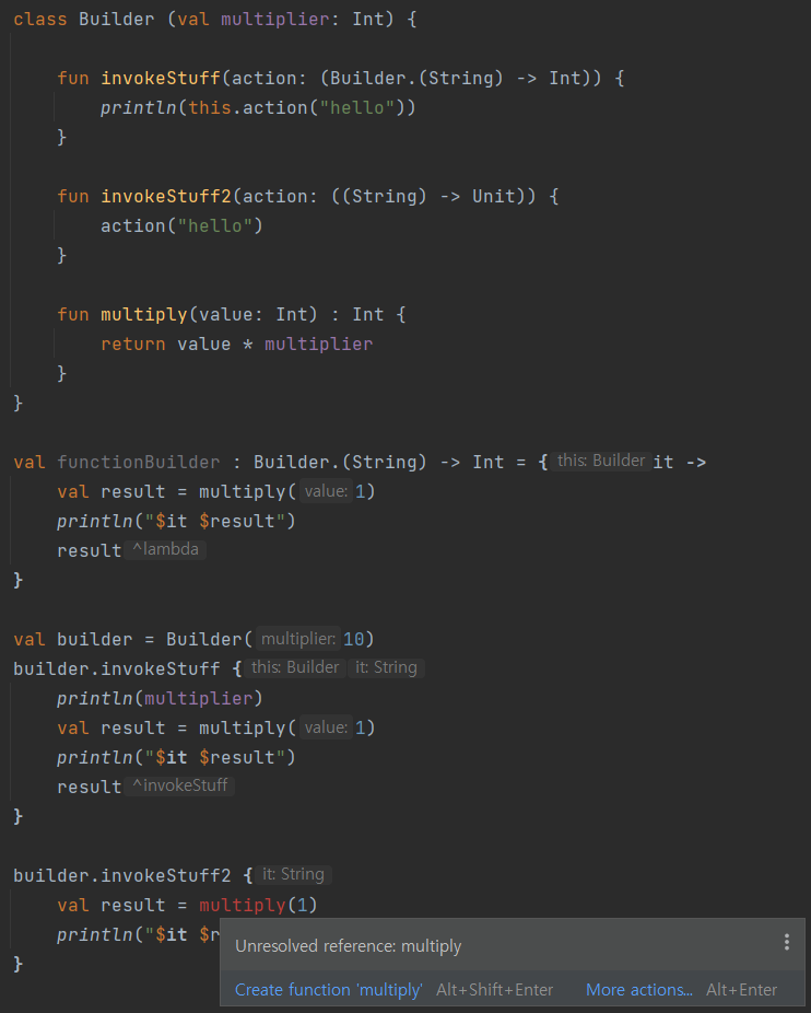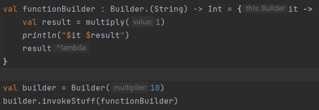 3> 위와 같이 invokeStuff에 lambda로 (String) -> Int 타입의 함수블록을 전달한다. 그런데 이 블록의 context는 Builder Class안에 있도록 타입을 Builder.(String) -> Int 로 해놓으므로 Builder의 메소드들(multiply)이나 변수(multiplier:Int)에 대한 호출이 가능하다. 따라서 위와 같이 실행코드에서 lambda블록안에 변수와 함수를 호출한 부분을 볼 수 있다.
