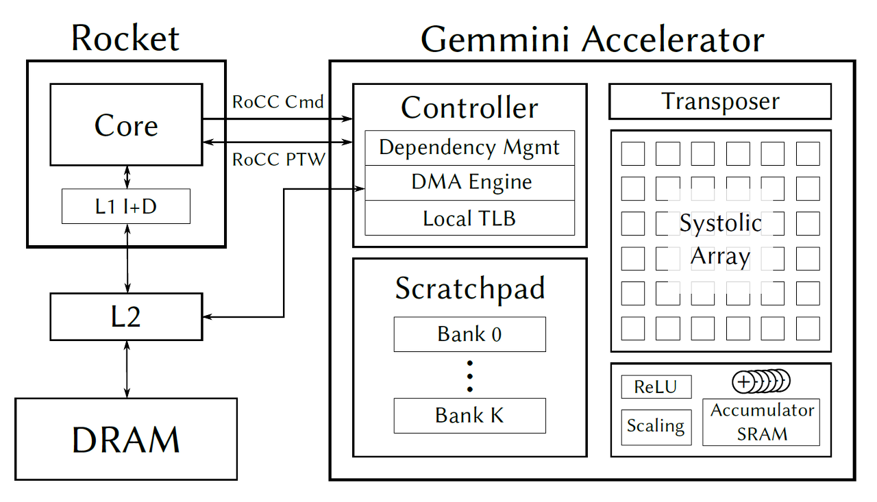 1> Gemmini는 RISC-V custom instructions를 지원하는 RoCC accelerator로 구현되는 프로젝트이다.