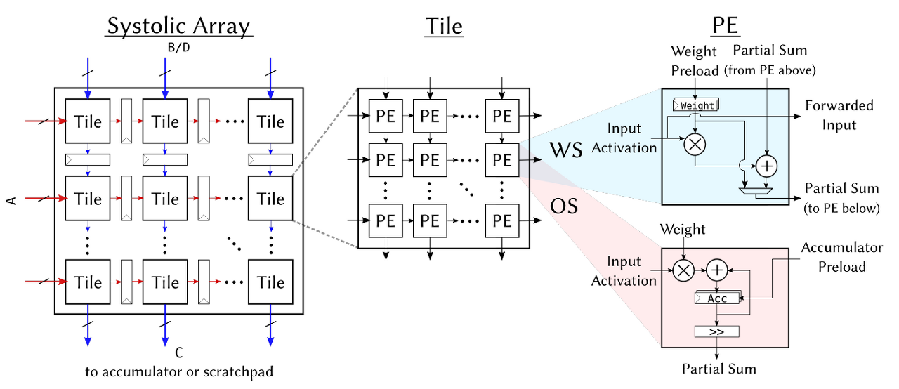 3> accelerator 핵심은 systolic array이 어떤 식으로 동작할지를 설계하는 것이다. 이는 multiplication 를 수행하는 matrix이며 OS, WS라는 output-stationary and weight-stationary dataflows를 지원하고 이를 programmer들은 실시간으로 이를 picking하며 컨트롤할 수 있다. 그러나, dataflow는 elaboration time( .scala -> .v 로 제너레이팅 되는 시점)에 고정되어 바꿀수 없다.