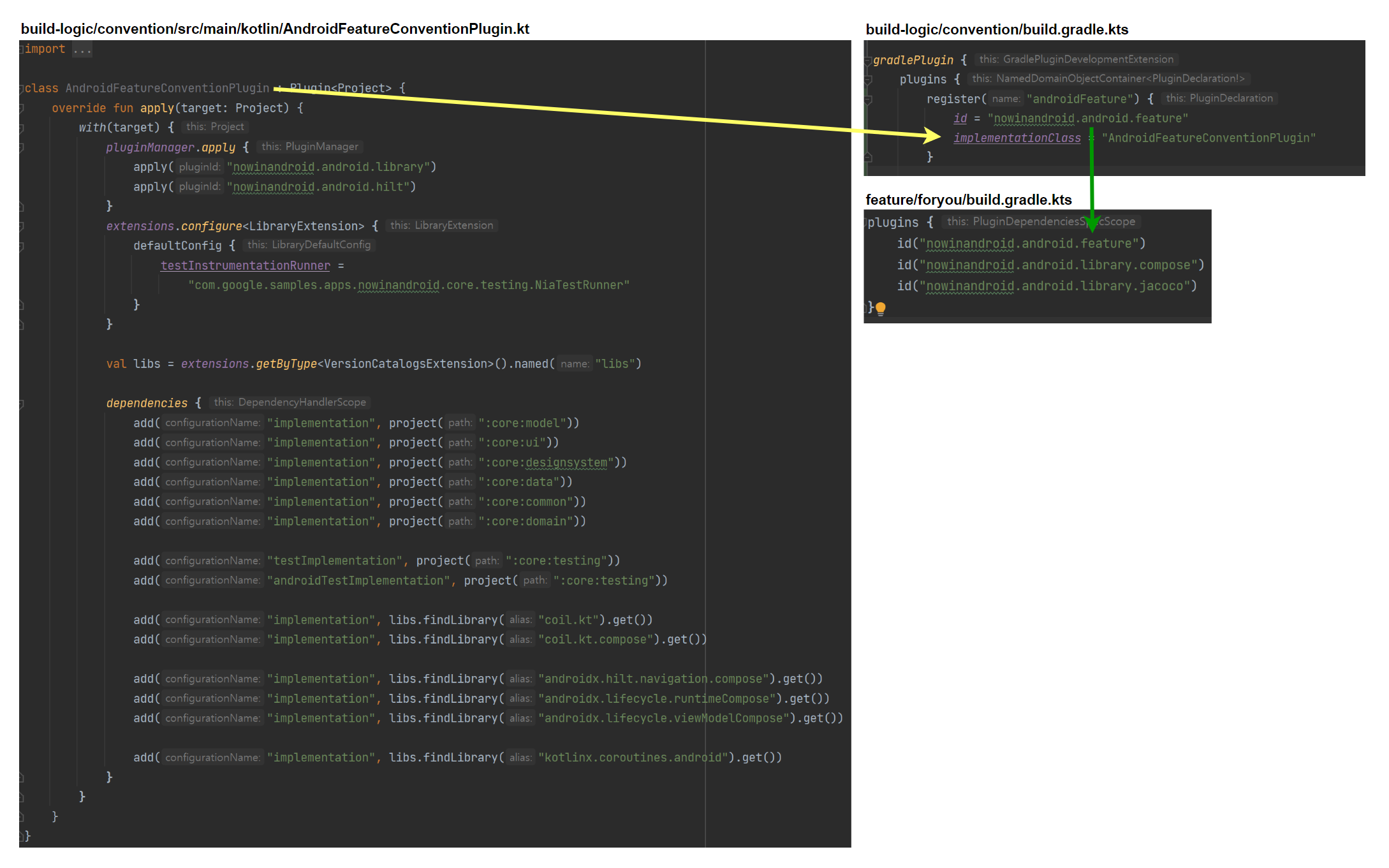 3) build-logic / convention / build.gradle.kts의 gradlePlugin 에 plugins 블록 아래 다음을 추가한다(default form은 google의 NowInAndroid build-logic form형태를 따름)