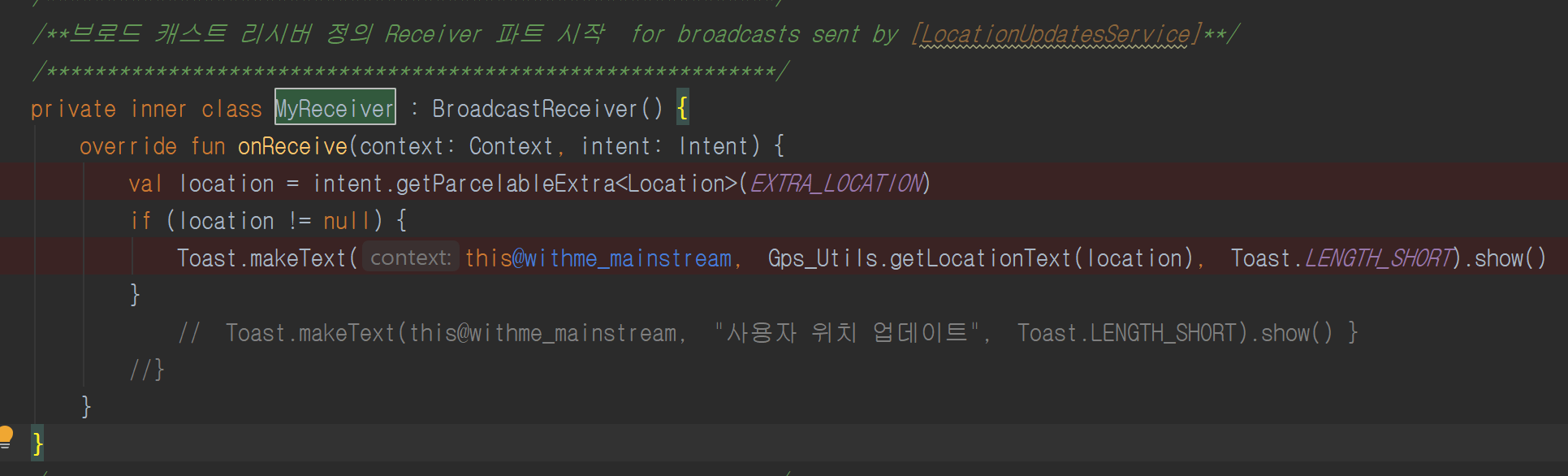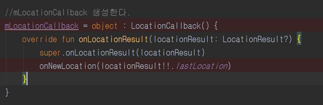 콜백이 일어나면 onNewLocation 메소드에서 lastLocation인자를 받아 처리하고 이를 브로드 캐스팅하여 처리하는데