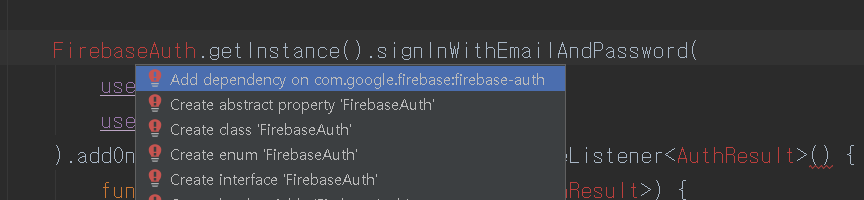 로그인 액티비티 파일의 변환과정에서 FirebaseAuth가 빨간줄인데 alt+enter를 누르면 디펜던시를 추가할수 있다.