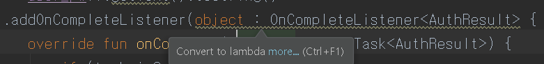 OnCompleteListener<AuthResult>() 부분에서는 constructor가 없으니 ()를 지워준다.