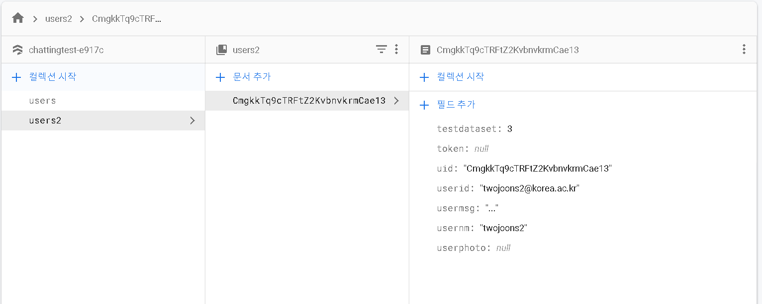 아래와 같이 collectionPath의 이름도 바꾸고 데이터도 한개 추가해보았다.