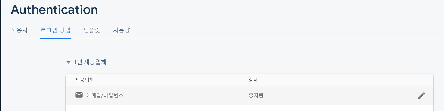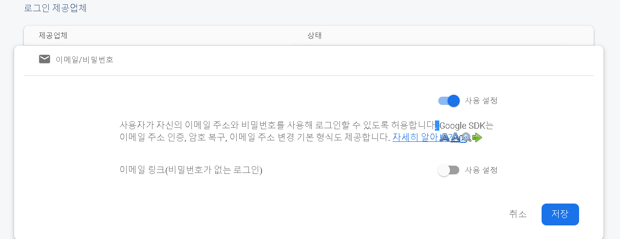 회원가입을 위해서 파이어베이스 콘솔 인증 페이지에가서 아래를 세팅해준다.