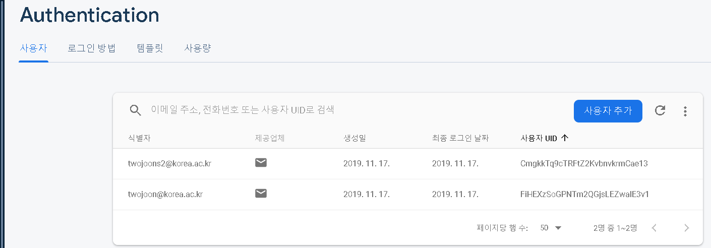 아무튼, signInWithEmailAndPassword 메소드가 요구하는건 패스워드와 이메일인데, dbPath가 다르더라도 인증란에 등록된 애는 하나로 관리 되도록 되어있다. db를 따로 만든 것은 아마 UID를 통해 db로 접근하는 구조로 만들기 위해서 인것 같다.