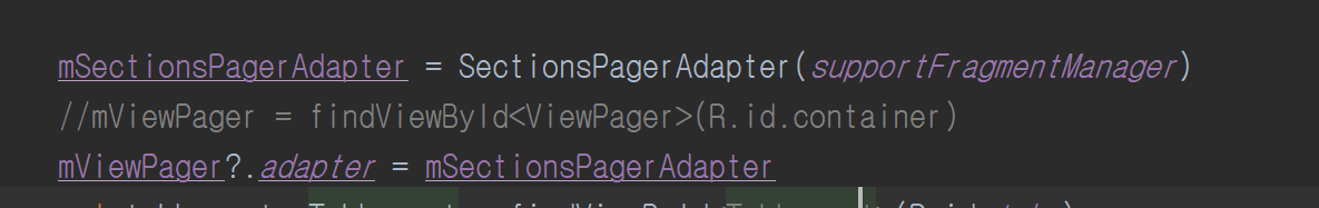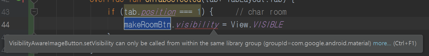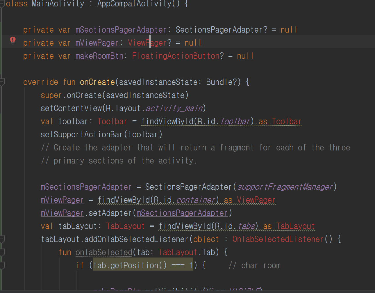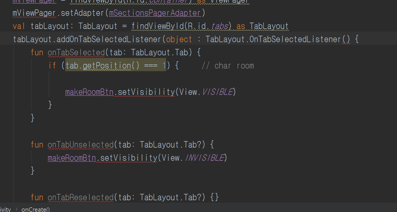 onTabSelected와 같은 부분은 override 키워드를 붙여주고, field접근을 코틀린 스타일로 바꾼다.