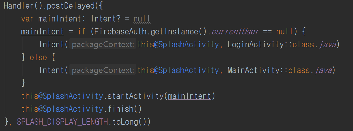 위 부분은 Handler 클래스를 이용하여 딜레이를 주는 것이다. postDelayed메소드는 SPLASH_DISPLAY_LENGTH.toLong() 만큼 대기한뒤 인텐트를 실행하는 것이다.