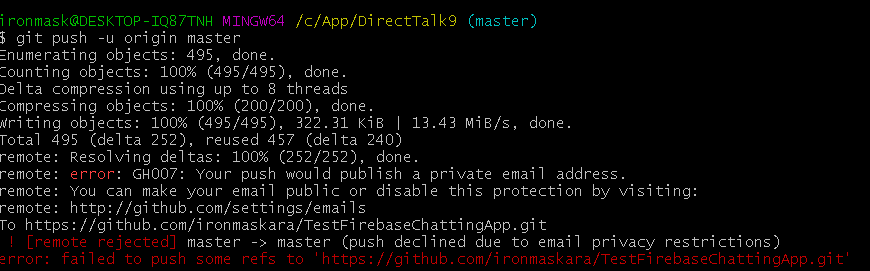 그러고서 바뀐 것을 확인하고 푸시를 해보면 push denied가 되는데 이는 git bash에서 git push -u origin master 명령어를 써도 같은 오류가 떴다.
