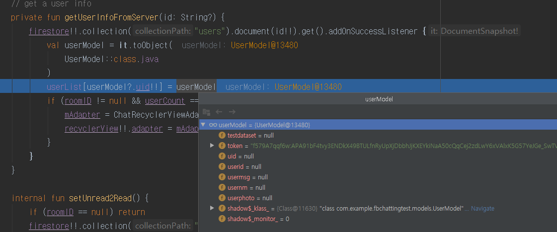 이때 usermodel의 uid가 null이므로 not null을 보장하는 uid!!을 사용하여 오류가 발생하는 것이다. 따라서 널처리를해주어야한다.